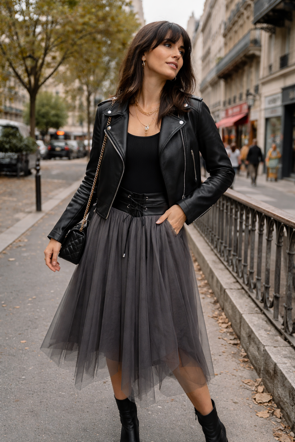Yenna Butik koleksiyonunun dikkat çeken parçalarından antrasit tül midi etek, romantik ve güçlü şehir stilini bir araya getiriyor. Hafif ve akışkan tül katmanları eteğe hacim kazandırırken, midi boy kesimi sayesinde zarif bir siluet oluşturur.